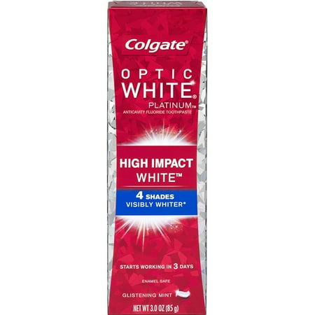 This enamel safe toothpaste deeply whitens teeth inside and out, unlike ordinary toothpaste. Colgate Optic White Platinum High Impact White Toothpaste makes your teeth shades visibly whiter (when brushing twice daily for six weeks) and starts working in just days. Oct 2 20Colgate Optic White Platinum High Impact White whitening toothpaste starts working in just days to make your teeth shades visibly whiter (when brushing teeth twice daily for six weeks).