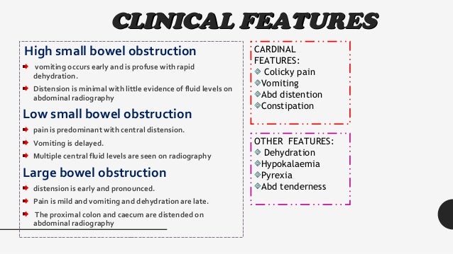Intestinal Obstruction: Causes, Symptoms, and Diagnosis An intestinal obstruction occurs when your small or large intestine is blocked. Abdominal pain which is mild and vague or severe and. The blockage can be partial or total, and it prevents passage of fluids and digested food. Intestinal obstruction - Symptoms and causes - Mayo Clinic Dec 1 20Vomiting and diarrhea are early signs of bowel obstruction.
