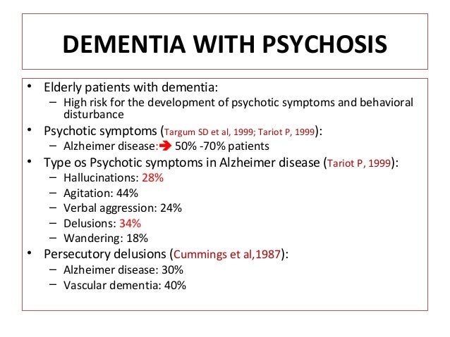 Dementia is the greatest risk factor for development of psychotic symptoms in the geriatric population both as a result of dementia itself and through an increased vulnerability to. Treating Psychotic Symptoms in Persons With Dementia CPI These medications are prescribed to treat agitation and symptoms of psychosis in persons with dementia who are living in all settings, including long-term care facilities, assisted living facilities, and at home with a caregiver. There are many different types of dementia, including Alzheimeraposs disease, Lewy body dementia, vascular dementia, frontotemporal dementia, progressive supranuclear palsy, corticobasal degeneration, normal pressure hydrocephalus and CreutzfeldtJakob disease. Dementia is a loss of higher brain functions while psychosis is a loss of reality with all cognitive faculties intact.