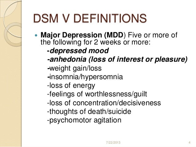 In addition to a listing and description of the symptoms, the DSM gives specific rules for making that diagnosis. One of them must be either Depressed mood or Anhedonia, named main criteria. Although the secondary symptoms can be divided into somatic and non-somatic clusters, the DSM-identify depression in all or none fashion. Depression Definition and DSM-Diagnostic Criteria Depression DSM-Diagnostic Criteria.