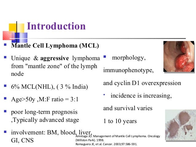 MANTLE CELL LYMPHOMA INDOLENT TYPE Cancer Survivors MCL is very aggressive but there is another form MCL takes that sounds like what you are describing. Indolent mantle cell lymphoma Haematologica Aug 0 20Mantle cell lymphoma (MCL) accounts for approximately of all non-Hodgkins lymphomas and is characterized by the over-expression of cyclin Dwith cell cycle dysregulation, secondary to the genetic abnormality t(11q13q32). It often has an aggressive clinical course and is generally associated with a poor prognosis.