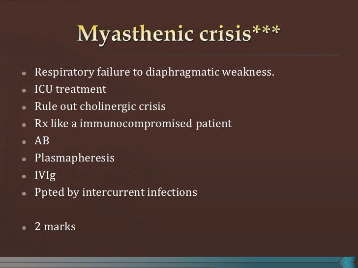 WebMD Mar 2 20ANSWER If you begin to have trouble breathing due to weakness of the respiratory muscles, you may need to be admitted to the hospital intensive care unit. Myasthenia gravis myasthenic crisis - EMCrit Project Mar 0 20In addition to treatment of the myasthenic crisis, management of the cause may be needed. Most myasthenic crises occur in the first few years after the diagnosis of myasthenia gravis, when the disease is often in its most active phase.